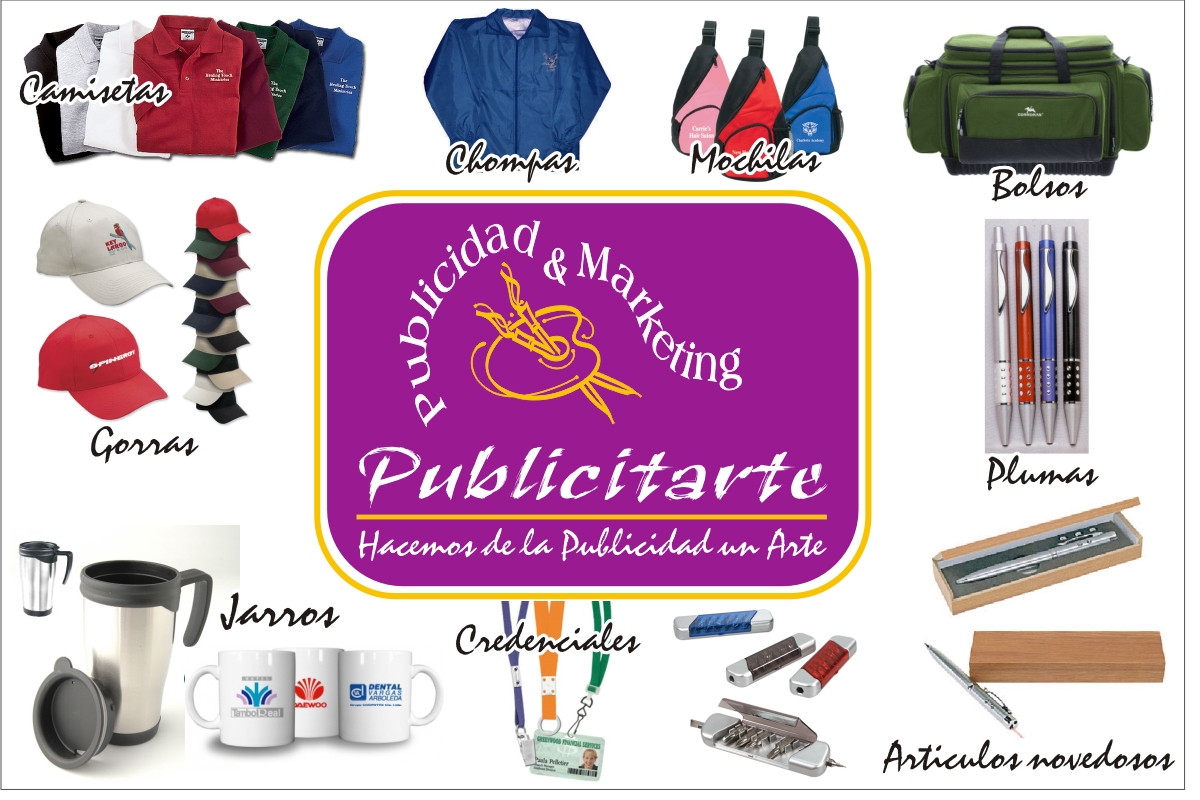 Plumas, jarros sublimados, camisetas polo pique dry fit bordadas o sublimadas, gorras camioneras sublimadas o de algodón bordadas, mouse pads, llaveros, paraguas, tomatodos, roll up, folletos, cuadernos corporativos, franelas y un sinnúmero de artículos.